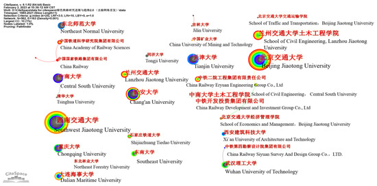 This study generates the cooperation map of green railway research institutions to investigate the cooperation among different institutions, as shown in Figure 1. Where the node is the organization name, the node size represents the number of published papers. The node ring represents the citation ring and the citation history of the literature. Different colors and sizes represent the corresponding citation time and number. Label size indicates centrality. The line between the two nodes indicates institutional cooperation. There are a total of 562 nodes and 163 connections in the institutional cooperation network, and the overall density of the network is 0.0011, which is relatively sparse. It can be seen that in green railway research, cooperation results between different institutions are few.