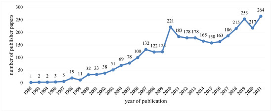 This paper aims to understand the changing trend of published green railway pieces of literature in China by statistical analysis of 3259 samples of literature collected from CNKI. As can be seen from Figure 3, before 1997, less attention was paid to green railways in China, and the number of articles published annually was five or fewer. Since 1997, the number of published papers has shown a trend of fluctuating rise, especially in 2009, which indicates that the study of green railways has gradually attracted the attention of domestic scholars. The number of published papers decreased slowly from 2010 to 2015 and increased steadily from 2016 to now.