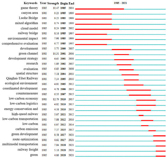 Emergent words are keywords that indicate the sudden increase of occurrence frequency or apparent increase of use frequency in a short period, which can directly reflect the research focus and hot spots of green railway research in a certain period [15]. Fifty-seven emergent words are obtained from the literature keyword analysis. The top 30 emergent words are shown in Figure 4. The red line indicates that a particular keyword, as an emergent word, has received special attention from the academic circle in a certain period.