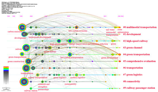 To further analyze the evolution process and characteristics of the topic in the research stage, the timeline view is first used for the cluster analysis of keywords. Through calculation, the Modularity Q in this paper is 0.5897, and the Mean Silhouette = 0.8748, which exceeds the minimum threshold standard, indicating that the clustering results are reasonable [10]. Figure 5 shows the timeline view of keyword clustering in green railway research, in which the horizontal axis represents time, and the vertical axis represents ten clustering keywords: multimodal transportation, development, high-speed railway, green channel, green transportation, comprehensive evaluation, transportation, green logistics, connectivity, and railway passenger station (labeled #0 to #9). The smaller the label, the larger the keyword clustering scale, the more keywords are contained in this category.