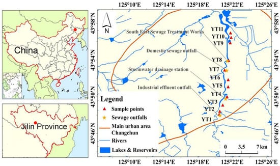 Maps of the locations sampled in Yitong River, Changchun, and Urban sewage outfall.