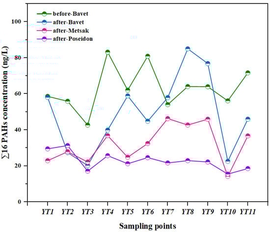 In the third sampling (before Poseidon and after Metsak), Σ16PAHs were high at YT7 and YT9, which are located downstream of the industrial effluent outfall near the CHP II plant and therefore receive more effluent, and Σ16PAHs were low at YT3 and YT10. The results of this spatial distribution of PAHs were consistent with those of the second sampling. In the fourth sampling (post-Poseidon), Σ16PAHs were the highest in YT1 and YT2, and the lowest in YT10. The discharged water from the Southeast Wastewater Treatment Plant near YT1 was returned to the Yitong River as landscape water, which may be the direct cause of the high PAH concentrations in this study. YT2 is located near the South Third Ring Road stormwater outfall, and the initial stormwater pollution is usually complex in composition and high in pollutant concentration.