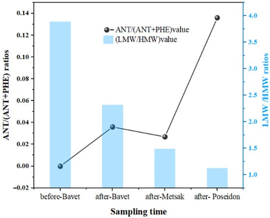ANT/(ANT + PHE) ratios and LMW/HMW ratios for 16 PAHs.