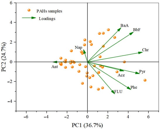 The first three factors accounted for >70% of the variability. Considering the outcomes of a prior investigation [46,47,48,49], diagnostic PAH compounds from different sources were selected. Flu was used as a diagnostic PAH compound to quantify coke oven emissions; Phe, Pyr, Ant, and Chr were used to quantify PAH compounds originating from coal combustion; and BaA and Acy were considered to reflect natural gas and fuelwood biomass combustion, respectively, whereas Nap denoted the source as oil spills. BbF in the environment is mainly derived from the combustion of coal and oil. The results of the principal component analysis (Figure 5) showed that principal components 1, 2, and 3 accounted for 38.4%, 19.2%, and 12.9% of the variability in the Yitong River water samples, respectively. Factor 1 contains high concentrations of Chr, Pyr, and BbF, which are typically present in high concentrations of coal combustion discharges; therefore, the first principal component can be considered to represent a coal combustion source. Factor 2 contains high concentrations of BbF and BaA, where BaA dominates the natural gas combustion signal; therefore, factor 2 is considered to represent the contribution of coke oven and gasoline combustion. Factor 3 is dominated by Nap and Ant, reflecting contributions from coal combustion and oil spills. Our results therefore suggest that PAHs in river waters are contaminated by a mixture of water bodies contaminated from coal and motor vehicle petroleum combustion emissions and petroleum spills.