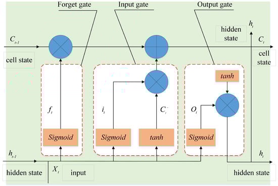 The LSTM was originally proposed by Hochreiter and Schmidhuber [30]. Due to the rise of deep learning, LSTM has undergone several development phases, resulting in a relatively systematic and complete LSTM framework, which has been widely used in many fields. The LSTM neural networks are a significant improvement to RNN networks that use self-connected memory units and gate units in the hidden layer to solve the vanishing gradient problem or gradient explosion problem in RNN [31]. The LSTM has a strong generalization capability and high learning ability for both larger and smaller datasets, which is advantageous in dealing with nonlinear problems [32]. The structure of the basic LSTM unit is shown in Figure 1.