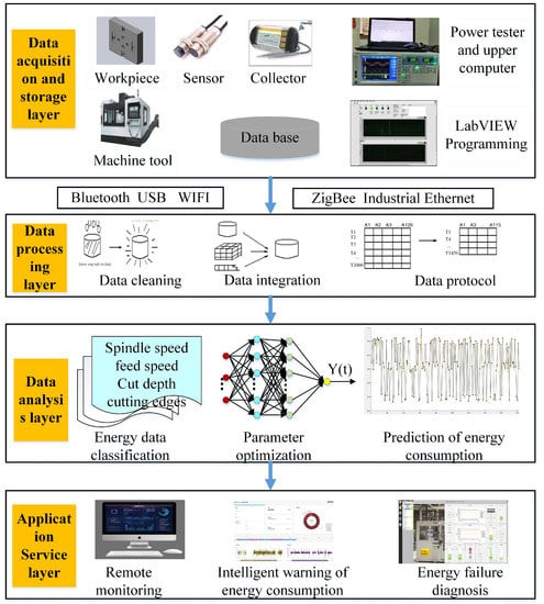 The proposed processing EC prediction model framework consists of four parts: (1) data acquisition and storage layer; (2) data preprocessing layer; (3) data analysis layer; (4) application layer. Each layer is composed of several modules to realize the prediction of processing EC, as shown in Figure 2.