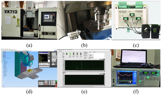 Milling machining energy efficiency prediction platform. (a) CNC milling machine; (b) photoelectric sensor; (c) Hall sensor; (d) CNC machining simulator; (e) real-time EC acquisition; (f) power tester and host computer.