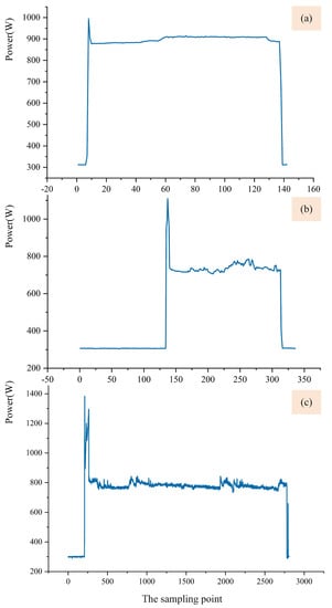 Acquisition of real-time power data for processing different features. (a) Real-time power of milling planes. (b) Real-time power for drilling. (c) Real-time power for milling slots.