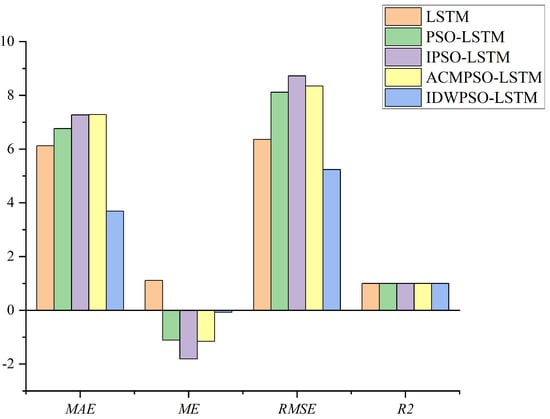 The mean errors of the five methods were 1.113, −1.110, −1.810, −1.154, and −0.0725. It is shown that the DIWPSO-LSTM method proposed in this paper is superior to other methods in terms of ME value. The MAE of the DIWPSO-LSTM method also improved by 39.73%, 45.44%, 49.26%, and 49.36% compared to other methods. The RMSE of the DIWPSO-LSTM method improved by 17.70%, 35.47%, 36.96%, and 37.27% compared to other methods. Through experimental comparison, it is found that the double-layer LSTM prediction model works much better than other improved methods.