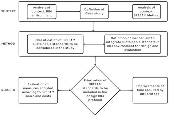 To achieve this objective, on the one hand, a literature review was carried out to define the context in which the research is framed and previous lines of work, in terms of the mechanisms of energy analysis, environmental impact, and lifecycle analysis in buildings; the definition of green certifications in buildings; and studies that integrate the use of building information modeling (BIM) in the analysis of sustainability in the construction sector [46].