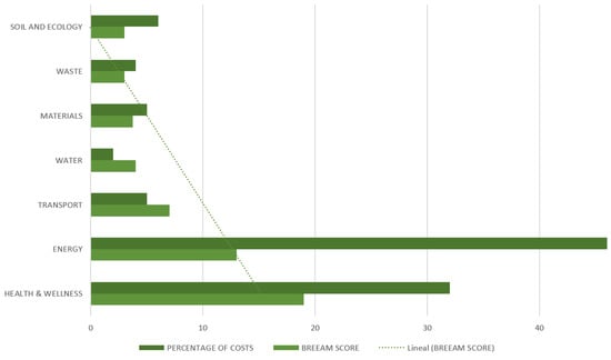 On the one hand, the BREEAM seal offers a score for each standard analyzed. The total score achieved is the sum of all standards (between 0 and 100), and these total points define the BREEAM classification of the building, according to Table 2. Since the study focuses on selected standards, a weighting of the score of these standards with respect to the total is carried out, to define the best- and worst-scored standards.