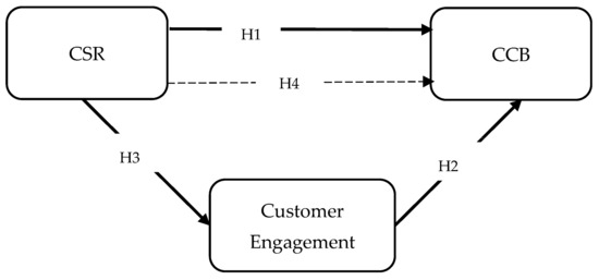 The favorable impact of customer engagement behavior on customer loyalty has been well-documented in the literature. Engaged customers will commit to any behaviors that help the business [17]. Such behaviors may also include extra-role voluntary and discretionary citizenship behaviors, which go beyond the in-role loyalty behavior that focuses only on repurchase. The term “CCB” refers to client contributions that are beneficial and constructive but are not necessary for the delivery of the company’s core services yet collectively help the company provide successful services [22]. Employees that are engaged in their work exhibit higher levels of CCB toward the organization according to organizational literature [22]. In a similar vein, we contend that customer perceptions of CSR are more likely to affect and manifest customer loyalty to the brand. Engaged customers perform advocacy behavior, have a deep connection to the brand, and are less inclined to switch. They prioritize strong bonds over slight adjustments to the offers. Engaged customers participate in CCB and aim to maintain high interaction and solid ties with the business. According to this study, customer engagement encourages both in-role and out-of-role conduct. Thus, we state: