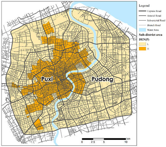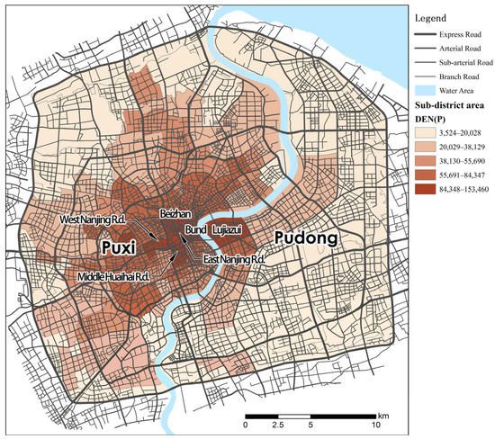 Figure 4 shows the value for the sub-district scale in central Shanghai. In general, the high-value contiguous areas in Puxi are relatively high, but extremely high-value areas are distributed in both Pudong and Puxi. Judging from the sum of the residential and employed population density, the sub-district with more than 50,000/square kilometers includes Lujiazui, Bund, Beizhan, East Nanjing Road, Middle Huaihai Road, and West Nanjing Road.