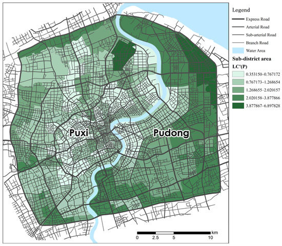 Figure 3 shows the value for the sub-district scale in central Shanghai. In general, the value in the Puxi area is higher than that in the Pudong area, indicating that the road network structure in Puxi is more suitable for bus transits and more low-carbon friendly, regardless of the employment and residential population density in the region. Areas that perform particularly well in Puxi include the north-central Huangpu District, the southeast Jing’an District, and the south Hongkou District.