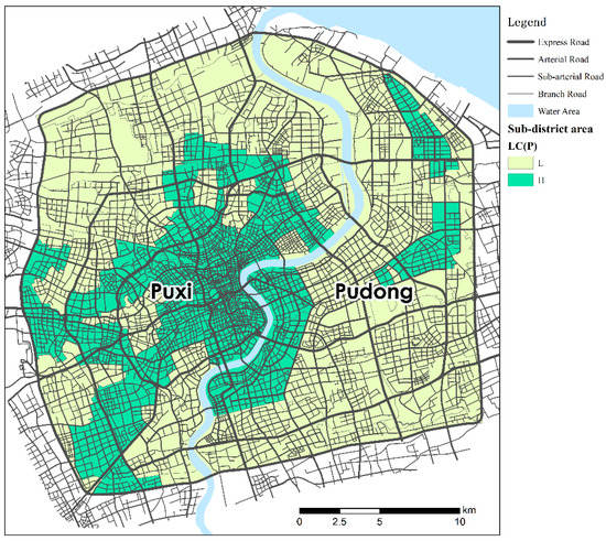 The light-yellow area in Figure 8 is the “LL” area; that is, the road network conditions are relatively unsuitable for bus transits, and the residential and employed population densities are relatively low. These areas are relatively more widely distributed in Pudong, which can properly supplement car traffic.