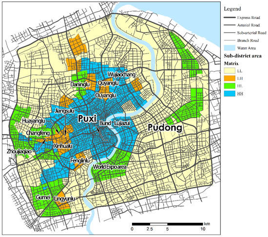 Figure 6 shows the relationship between the value and median value for the sub-district scale in central Shanghai, and Figure 7 shows the relationship between the value and median value for the sub-district scale in central Shanghai. On this basis, the matrix analysis results of and for the sub-district scale in central Shanghai are calculated, as shown in Figure 8.