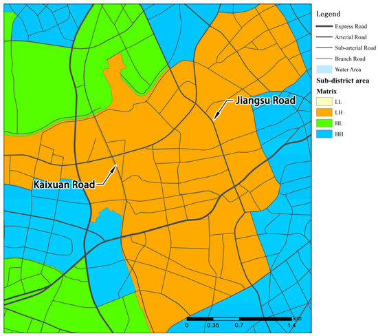 The orange area in Figure 8 is the “LH” area; that is, the road network conditions are relatively unsuitable for bus transits, but the residential and employed population densities are relatively high. Representative areas include the eastern area of Changning (Jiangsulu, Huayanglu, Xinhualu Zhoujiaqiao), Fenglinlu and Lingyunlu of Xuhui, Quyanglu, and Ouyanglu of Hongkou. These areas need to further improve the construction conditions of the road network.