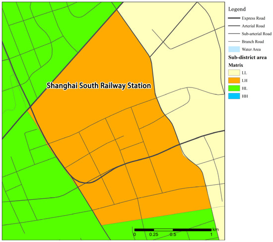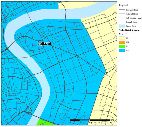 The blue area in Figure 8 is the “HH” area; that is, the road network conditions are suitable for bus transits, and the residential and employed population densities are also relatively high. They are mainly concentrated in the sub-district of Bund, Lujiazui, and Wujiaochang. In these areas, it is necessary to strengthen the construction of high-capacity forms of transit, such as rail transit, while strengthening the construction of ground road network.
