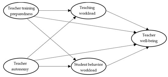 Moreover, Bakker et al. proposed that job resources can act as a buffer against the negative impacts of job demands on work engagement [7,12]. Another avenue of exploration is to investigate whether resources that reduce workloads can lead to improvements in teacher outcomes, such as well-being. Thus, we attempted to expand upon the JD-R theoretical framework by examining the role of job demands (specifically teacher workloads) as a mediator. Our study was designed to investigate the relationships among teacher resources (i.e., teacher training preparedness and teacher autonomy), teacher workloads (i.e., teaching and student behavior workloads), and teacher well-being. Figure 1 outlines our hypothesized model, and our hypotheses are as follows: