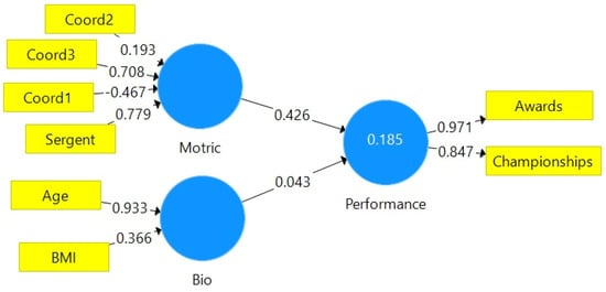 Furthermore, we designed a structured equation model (SEM) form with three variables: motor, bio, and performance. The motor variable is a formative one and is made of three tests of coordination and explosive force (Sargent test). Another formative variable is bio, which is formed of age and BMI (body mass index). We eliminated height and weight due to multicollinearity. The reflective variable indicates the performance of the athletes and represents the number of participations in national and international championships and the awards place (0 points—greater than 4, 1 point—place 3, 2 points—place 2, 3 points—place 1). We tested if the athletes’ motric and the biological traits influence their performance in competitions (participation in international competitions and the place obtained).
