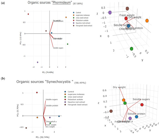 Principal component analysis illustrating the effect of different extracts on fresh weight, dry weight (mg/100 mL), soluble sugars, proteins (mg g−1 f.m) and chlorophyll a content (µg g−1 f.m) in (a) Phormidium sp. And (b) Synechocystis sp.