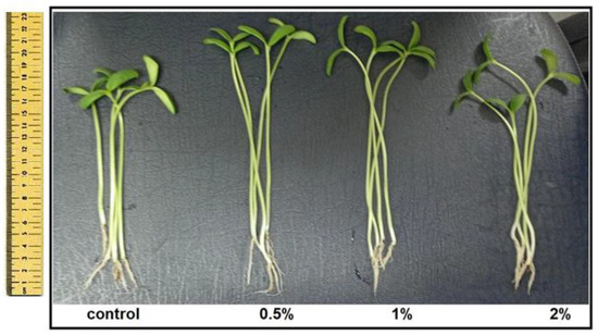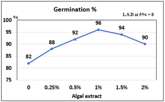Effect of different concentrations of algal extract of Phormidium sp. on the germination of cantaloupe seeds for 4 days. Values represent the mean of five replicates.