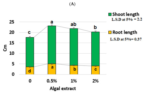According to [60], fertilizers containing cyanopith and cyanospray increased the biochemical characteristics of Aloe barbadensis, including the amounts of total chlorophyll, chlorophyll a, chlorophyll b, carotenoids, sugars, and free amino acids, because more nutrients are present in the soil treated by cyanopith, the plant’s nutrient status has improved. Similar outcomes were attained by Anandharaj [61] on Alium cepa and Oryza sativa and [62] on Helianthus annus. Results agree with Rajula and Padmadevi [63], on Helianthus. annuus L. and [64] on pea. The activities of nitrogen as well as nitrate reductases may be responsible for the improvement in growth and nitrogen contents in response to the application of cyanobacteria as bio-fertilizers on seed and related processes of wheat, sorghum, maize, and lentil [65]. From previous reports, the development of plants is known to be aided by cyanobacteria like Arthrospira platensis and Nostoc muscorum, which can increase plant growth, yield, protein and carbohydrate content [66]. According to [67,68], wheat plants treated with various cyanobacterial strains, such as Nostoc sp., Anabaena sp., Chroococcidiopsis sp., Calothrix sp., and Phormidium sp., showed improvements in shoot length, lateral root formation, dry weight, and leaf area. It appears that the extensive range of bio-active chemicals produced by cyanobacteria, which may play a direct or indirect role in cell division, cell expansion, and root initiation, have a good impact on seed germination and seedling growth indices [69].