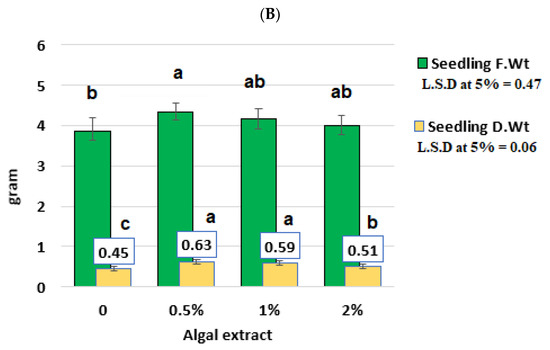 Effect of different concentrations of algal extract of Phormidium sp. on (A) shoot length, root length and (B) seedling fresh wt., seedling dry wt. of cantaloupe. Values represent the mean of five replicates. Different letters (a, b, c and d) indicate statistical differences at 5% probability according to Duncan’s test. Error bars are standard errors of the mean, f.wt (fresh weight) and d.wt (dry weight).