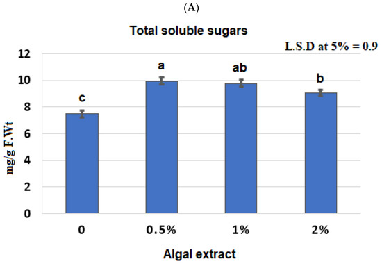 Effect of different concentrations of algal extract of Phormidium sp. on (A) total soluble sugars and (B) total soluble protein of cantaloupe. Values represent the mean of three replicates. Different letters (a, b and c) indicate statistical differences at 5% probability according to Duncan’s test. Error bars are standard errors of the mean.