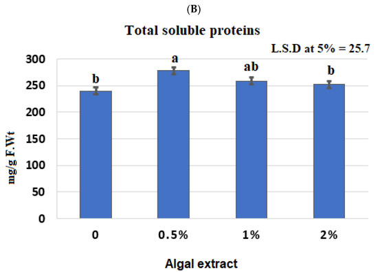 The data presented in (Figure 7) shows that the total soluble protein and sugar contents significantly increased after being pretreated with cyanobacterium Phormidium sp. extract especially at 0.5% by (9.96 and 278.19 mg/g), respectively, compared to (7.49 and 240.35 mg/g) for the control plants.