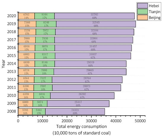 With the development and progress of the regional economy, energy consumption demands in the Beijing–Tianjin–Hebei region have increased each year from 2008 to 2020. Although the total energy demand is increasing, the growth rate of the energy demand is gradually slowing down. As shown in Figure 1 below, in 2020, China’s total energy consumption and that of the Beijing–Tianjin–Hebei region were 498,000 million tons of standard coal and 476.49 million tons of standard coal, respectively; in 2008, these values were 3206,110,000 tons of standard coal and 354,720,700 tons of standard coal, respectively. It can be seen that the increase in energy consumption in the Beijing–Tianjin–Hebei region is in line with actual national energy consumption; however, the proportion of energy consumption in the Beijing–Tianjin–Hebei region accounted for 11.06% of total consumption in 2008 and 9.57% in 2020, showing a lower overall decline.