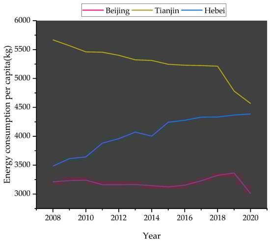 As can be seen from Figure 2, per capita energy consumption in the three regions of Beijing, Tianjin, and Hebei showed a slow growth rate. Per capita energy consumption in Beijing showed a small increase from 2016 to 2019 and declined in 2020. In 2008, per capita energy consumption was 3267.19 kg of standard coal/person, while in 2020 it was 3089.13 kg of standard coal/person. From 2008 to 2020, per capita energy consumption was relatively stable with little fluctuation and was the lowest among the three regions. Per capita energy consumption in Tianjin fluctuated more, showing a roughly M-shaped trend. Although Tianjin’s per capita energy consumption has decreased in recent years, it is still the largest among the three regions. In Hebei Province, per capita energy consumption increased each year. In 2008, per capita energy consumption was 3480.02 kg standard coal/person, while in 2020 it was 4392.21 kg standard coal/person. Hebei’s per capita energy consumption was found to be at an intermediate level between the other two regions.