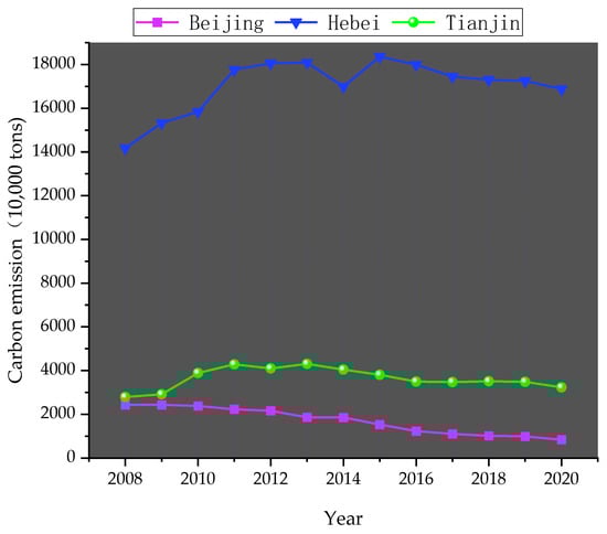 In this study, we selected 14 samples from 2008 to 2020 as research data to calculate carbon emissions in the Beijing–Tianjin–Hebei region. Fossil energy data based on the measurement of carbon emissions were derived from the regional energy balance sheet in the China Energy Statistical Yearbook (2009–2021). Carbon emissions in the Beijing–Tianjin–Hebei region from 2008 to 2020 were calculated using Formula (1) (see Table 14). A comparison of carbon emissions between the three regions is shown in Figure 3.