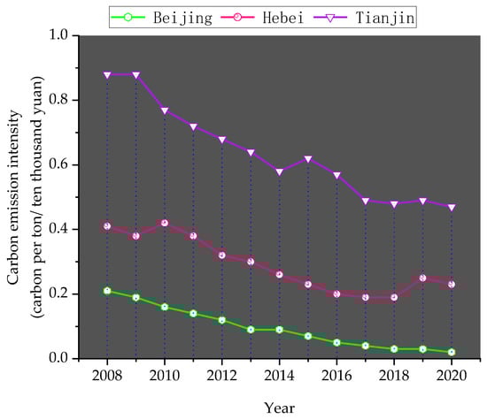 Carbon intensity is equal to carbon dioxide emissions per unit of GDP and can be affected by many factors, such as energy consumption, the pollutant carbon emission coefficient, etc. In addition to the development of energy-saving technologies, upgrading industrial structures and opening the regional economy will also restrict the size of carbon intensity. As can be seen from Table 15, with the development of the economy and the progress and application of energy-saving technologies, carbon emission intensity has decreased each year, with some fluctuations. The carbon emission intensity of the Beijing–Tianjin–Hebei region from 2008 to 2020 was obtained using the following formula: carbon emission intensity = carbon emissions/GDP.