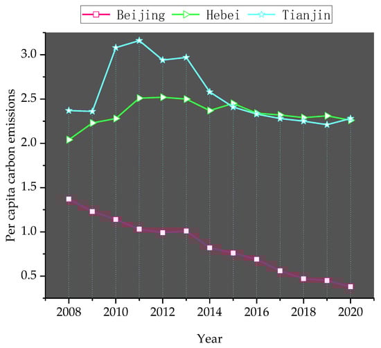 Per capita carbon emissions eliminate the differences in regional total amounts, which is more conducive to a comparative analysis of carbon emissions between regions. It can be seen from Figure 5 that the per capita carbon emissions in Beijing consistently showed a decreasing trend each year, while the per capita carbon emissions in Hebei and Tianjin were much higher than those in Beijing. Among the three regions, the per capita carbon emissions in Tianjin increased each year until 2011, at which point they reached their highest value (3.16) and then began to decrease slowly; this was followed by a small increase in the past year. Per capita carbon emissions in Hebei Province are on the rise as a whole. By 2020, Beijing’s carbon emissions per capita were 0.45 tons carbon/person; for Tianjin and Hebei, carbon emissions per capita were 2.28 and 2.31 tons carbon/person, respectively. On the whole, the three places all show a downward trend, which is closely related to China’s economic development and policy protection in recent years. For example, research on China’s Air Pollution Prevention and Control Action Plan proposed in 2013 shows that the APCAP can effectively reduce China’s per capita carbon emissions at the national level without considering the spatial spillover effect. This is consistent with the development trend of the Beijing–Tianjin–Hebei region [27].