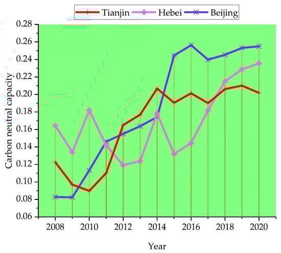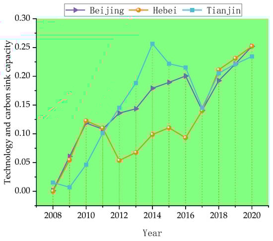 It can be seen from Figure 9 that the technology and carbon sink capacity of the Beijing–Tianjin–Hebei region gradually increased, with some fluctuations, from 2008 to 2020. Since 2017, this growth trend has continued gradually as it is closely related to national policies, where the carbon peak and carbon neutral target, technological innovation, and the low-carbon economy have gradually become a new path for regional economic growth. The technology and carbon sequestration capacity of Beijing increased from 0.0011 in 2008 to 0.2521 in 2020, that of Tianjin increased from 0.0153 in 2008 to 0.2344 in 2020, and that of Hebei Province increased from 0.0001 in 2008 to 0.2521 in 2020. In terms of improvement, the technology and carbon sink capacity of Hebei was the highest at 0.2520, followed by Beijing and Tianjin. From 2008 to 2011, the technology and carbon sink capacity trend in Beijing and Tianjin was basically the same. After 2011, Tianjin’s technology and carbon sink capacity gradually increased to a greater degree than that of Beijing, reaching a peak of 0.2565 in 2014, at which point it decreased with each year. It can be seen from the figure that the overall technology and carbon sink capacity of Hebei Province was not high from 2011 to 2016, especially with respect to the other regions; however, a significant increase was observed. After 2016, the gradual growth was finally higher than that of the other two cities in 2018.