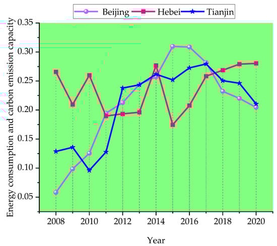 As can be seen from Figure 7, which shows the energy consumption and carbon emission capacity of the three provinces and cities from 2008 to 2020, Beijing had the lowest energy consumption and carbon emission capacity before 2010, at which point it rose annually until peaking at 0.3096 in 2015. This was followed by another decrease until 2020, where it had the lowest level of the three provinces and cities at 0.2046. The minimum energy consumption and carbon emission capacity in 2010 was 0.0961. After that, it increased each year and did not decline until 2017. Energy consumption and carbon emission capacity were at a midpoint in 2020. Before 2010, Hebei Province had the highest values, despite fluctuations in energy consumption and carbon emission capacity; since then, although a decline was observed, energy consumption and carbon emissions in Hebei have increased each year since 2015, and they surpassed Beijing and Tianjin as of 2018. According to our analysis of Beijing, Tianjin, and Hebei, as high energy consumption and high-emissions industries gradually transferred to Hebei province, the energy consumption and carbon emission capacity of the other two cities gradually declined. However, the transformation and upgrading of high energy consumption and high-emissions industries is imminent and will drive the coordinated development of the Beijing–Tianjin–Hebei region to reduce energy consumption and carbon emissions.