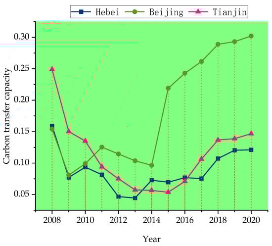 As can be seen from Figure 8, Beijing’s carbon transfer capacity trend during 2008–2009 was similar to that of Hebei Province and decreased to a minimum of 0.0808 in 2009, before rising in 2010 and 2011. Although there was a small decline in carbon transfer capacity after 2011, it was still the highest of the three provinces and cities and saw a significant increase after 2014, far more than the other two provinces and cities. Tianjin’s carbon transfer capacity has generally declined, despite a small increase after 2015; even after this rise, it was still significantly less than carbon transfer capacity in 2008. The carbon transfer capacity trend in Hebei Province was similar to that of Tianjin; however, overall, as the weakest of the three provinces, Hebei’s carbon transfer capacity needs to be strengthened. In terms of the degree of increase, only Beijing’s transfer capacity has risen (from 0.1541 in 2008 to 0.3021 in 2020). For Tianjin and Hebei Province, carbon transfer capacity has decreased to varying degrees since 2008; however, it has started to show an upward trend in the past three years and is expected to show a more significant increase in the future. From another point of view, with regard to carbon transfer ability in Tianjin and Hebei, a lack of attention was paid to the regional economy and trade, which led to a decrease in carbon transfer capacity after 2008. Beijing, however, hosted the 2008 Olympic Games, which led to an increase in regional openness and the degree of foreign trade, gradually improving carbon transfer ability in the region.