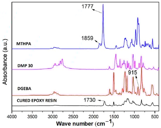 FTIR spectra of DGEBA, MTPHA, DMP-30, and cured epoxy resin.