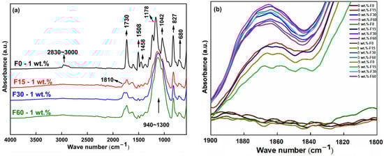 (a) FTIR spectra attained for 1 wt% Al2O3 epoxy resin composites using fluorination for 0 (F0), 15 (F15), 30 (F30), and 60 (F60) min; (b) Relationship between fluorination time/nanoparticle concentration and absorption peak intensity of COF bond in epoxy resin.