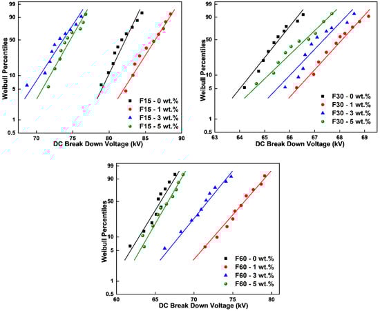 DC breakdown voltage of fluorinated epoxy resin/Al2O3 nanoparticles for 15 min (F15), 30 min (F30), as well as 60 min (F60) at different nano-Al2O3 concentrations.