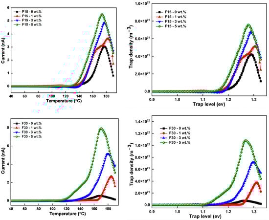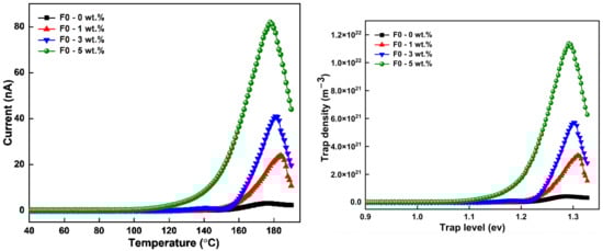 On the contrary, a long fluorination time, i.e., 30 and 60 min, leads to a slightly reduced trap energy level, which contributes to the destruction of the molecular structure and chain scissions. Table 3 shows the levels of trapped energy calculated from the current density curves of non-fluorinated and fluorinated epoxy resin\Al2O3 nanocomposites for 15 min (F15), 30 min (F30), and 60 min (F60) at different nano-Al2O3 concentrations. It can be observed that the trap energy level of the epoxy resin\Al2O3 nanocomposite initially increased at 1 wt% and later decreased at a higher concentration of nano-Al2O3. This comparison demonstrates that the energy level of both the shallow traps and the deep traps were located between 1.27 and 1.31 eV.
