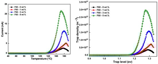 Figure 8 presents data from the TSC that show that the trap density of epoxy resin\Al2O3 nanocomposites increases with nano-Al2O3 concentration. Moreover, epoxy resin incorporated with 1 wt% nano-Al2O3 has a higher trap energy. The zone of interaction that may be found within the polymer matrix of epoxy resin and nano-Al2O3 has been considered an essential factor that significantly influences an epoxy-resin nanocomposite’s carrier mobility and electrical properties [26]. At a low nano-Al2O3 concentration, it is possible that the generated deep traps within the interface region will impede the mobility of the charge carriers, leading to a decrease in the trap density.