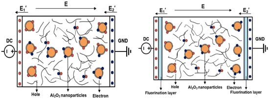 A single scenario, represented in Figure 10, of generation and transport of space charge in epoxy resin/Al2O3 nanocomposites before and after fluorination, was designed to understand the epoxy’s breakdown strength before and after fluorination. E is the electric field applied therein, and E1′and E2′ are the negative electric potential closer to the electrodes. It can be seen that charge injection decreases after fluorination. This occurrence is due to the suppression effect of the fluorinated layer that results in reducing the magnitude of the space charge injection, thus reducing conductivity [30,31]. Moreover, incorporating nano-Al2O3 significantly influences the crystallization process and changes the microcrystalline morphology of epoxy, generating a large number of small uniform spherocrystals. The interface between the crystalline and amorphous regions also increased. Massive charges are fixed near the electrode interface, resulting in the accumulation of homo charges, thus expanding the interface’s reverse electric field. Therefore, the electric interface field was significantly reduced, and the charges could not be quickly injected into the matrix, thus increasing the breakdown strength.
