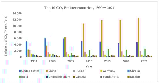 CO2 is emitted from different sources, and the largest amount of CO2 has been emitted from power plants and energy sectors. Therefore, with increasing energy production, the amount of CO2 emission also increases. Figure 1 shows the top 10 CO2-emitting countries, and it is clear that in recent years, China has been emitting the largest amount of CO2 because it has been producing the largest amount of energy. From the year 1990 to 2005, CO2 emissions increased by nearly 4000 million metric tons, while a sudden increase was observed in 2015, when the amount of CO2 emissions passed 10,000 million metric tons (MMT). Finally, in 2021, China’s CO2 emissions reached 12,000 MMT, and China became the largest CO2 emitter in the world. According to CO2 emissions statistics, the United States has been the second-largest emitter for the last two decades (2000–2021). From Figure 1, it can be observed that from 1990 to 2021, the CO2 emissions in the United States were not drastic. The amount of CO2 emissions was always in the range of 4000 to 6000 MMT.