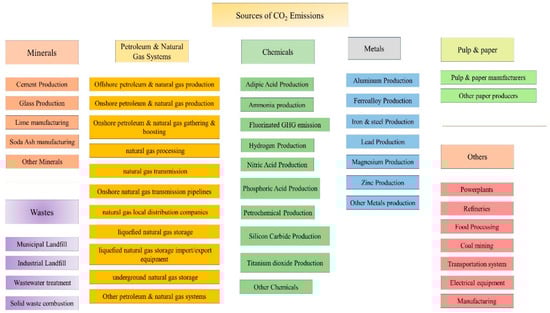 Major CO2 emitters in the U.S. are listed in Figure 2, including power plants, chemical and metal processing industries, petroleum and natural gas systems, food processing, coal mining, and other different major sources. These major emitters can be promising for capturing CO2 due to the large amount of exhaust CO2 in the system.