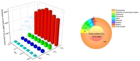 Power plants are the largest source of emitted CO2, which is clear from Figure 3. According to the EPA dataset, in the United States, there are 1369 facilities in total, from which 1660 MMT of CO2 was emitted in the year 2019. As populations grow, more power sectors are built, which leads to increased energy consumption. As a result, more power plants are developed, which causes a higher amount of CO2 emissions. The EPA has developed a statewide plan to control CO2 emissions from power plants, and these plans are listed in Section 111(d) of the Clean Air Act, where the EPA set different performance standards for multiple sources of pollution, which includes power plants. According to the EPA’s clean power plan, states have the responsibility to cut off 30% of CO2 emissions from power plant sectors from 2005 to 2030. To implement these acts, states have started implementing different policies to minimize power sectors’ climate impact [15]. The EPA has focused on four major opportunities to reduce CO2 emission from electricity production sectors, and these opportunities include the increased efficiency of fossil-fired power plants and fuel switching, renewable energy, increased end-use energy efficiency, and carbon capture and sequestration (CCS) [16,17].