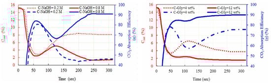 CO2 outlet concentration and CO2 absorption efficiency versus time under different NaOH concentrations (Qg = 200 mL/min, C-Gly = 8 wt%, T = 25 °C) and glycerol concentration at at (Qg = 200 mL/min, C NaOH = 0.5 M and T = 25 °C) [74]. Copyright permission © 2022 Published by Elsevier Ltd.