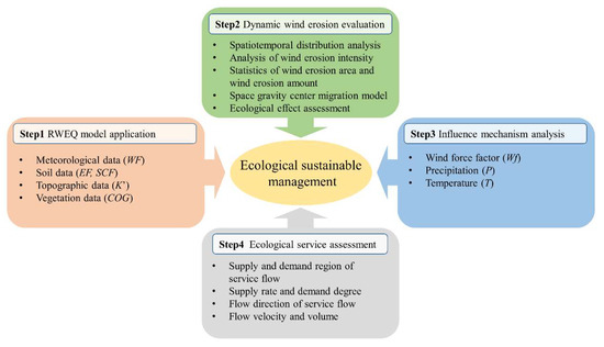 Wind erosion is a phenomenon of soil erosion, which refers to the process of topsoil being eroded and carried away by the action of wind [1]. Wind erosion causes the loss of soil clay, silt, and nutrients, leading to the change of soil texture and hence to desertization [2]. Wind erosion causes many crop losses, which severely threatens agricultural production and food security [3]. In addition, wind erosion can also cause sandstorms, which pollute the atmospheric environment and endanger human health [4]. According to the United Nations Environment Program (UNEP) statistics, the area of global soil degradation caused by wind erosion is about 5.48 × 106 km2, accounting for 46.4% of the degraded soil [5,6]. The wind erosion area in China has reached 1.61 × 106 km2 [7], which has become a considerable threat to ecological security and sustainable socio-economic development. Therefore, it is crucial to assess the regional wind erosion intensity and dynamic process to provide a basis for predicting the wind erosion development trend and carrying out desertization control.