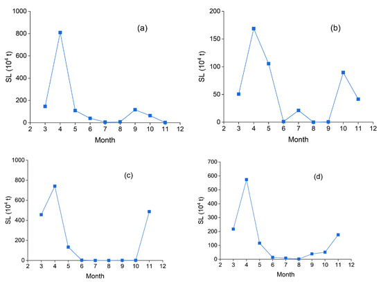 Monthly change of wind erosion amount in the northern Songnen Plain in 2010, 2014, and 2018. (a) 2010; (b) 2014; (c) 2018; and (d) three-year mean values. Here, monthly wind erosion is the sum of wind erosion of all 6.25 ha quadrats in one month. For example, the wind erosion amount in March 2010 was obtained by adding the wind erosion amount of all quadrats in the study area from March 1 to March 31, 2010.